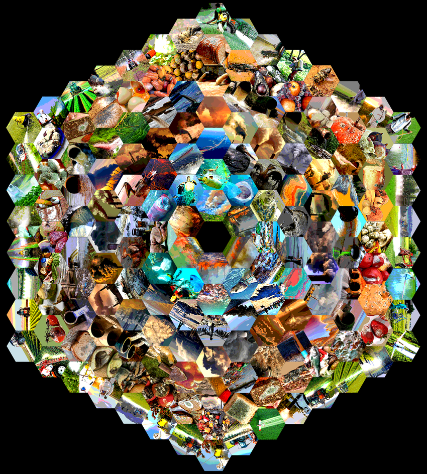 The work comprises a total of 2200 individual images (graphically manipulated photographs), each measuring 10 x 10 cm, resulting in a total size of 6 x 6 meters.